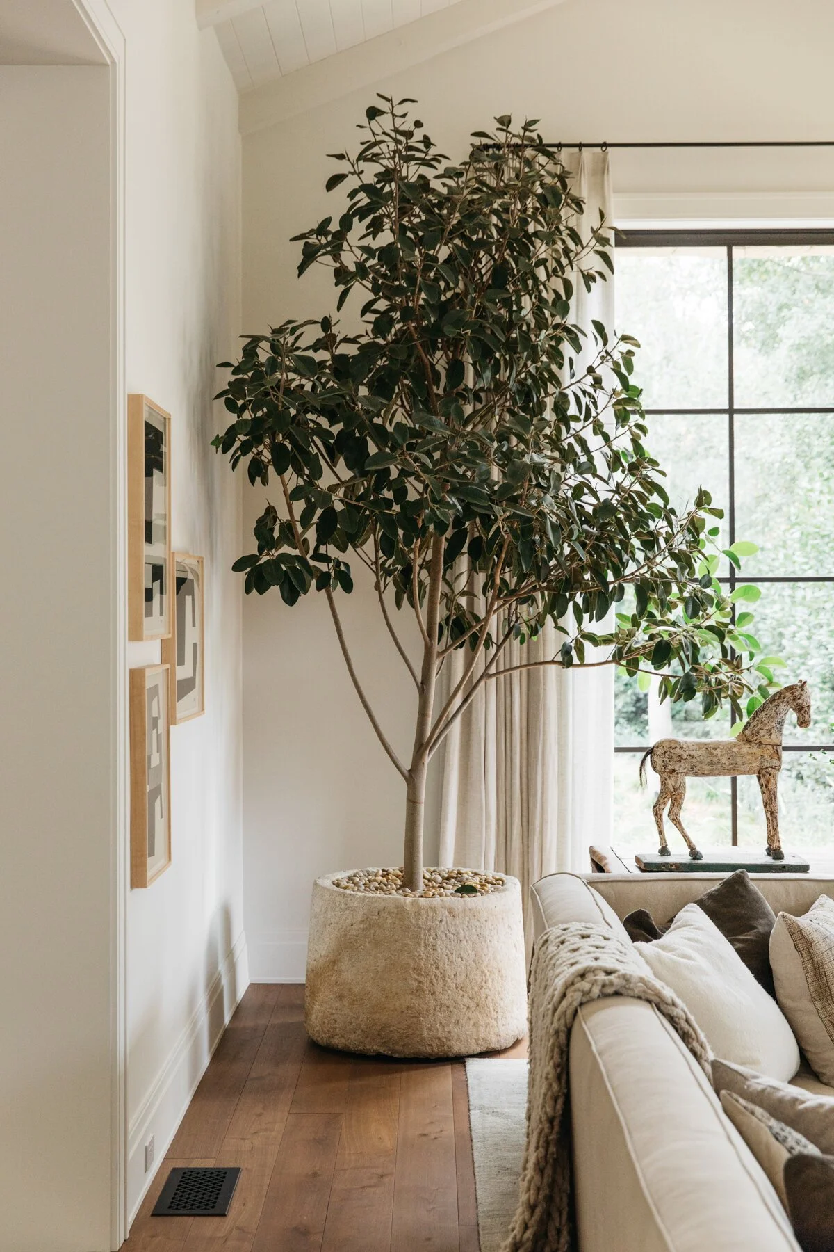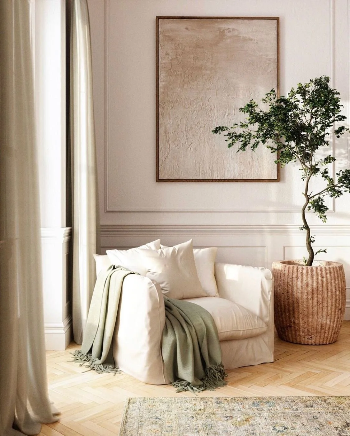 Na glavno zasnovo počasi dodajamo elemente z mehkimi ali gladkimi linijami, s pridihom naravnega. S tem prostor otoplimo in vanj vnesemo dodaten vizualni interes.